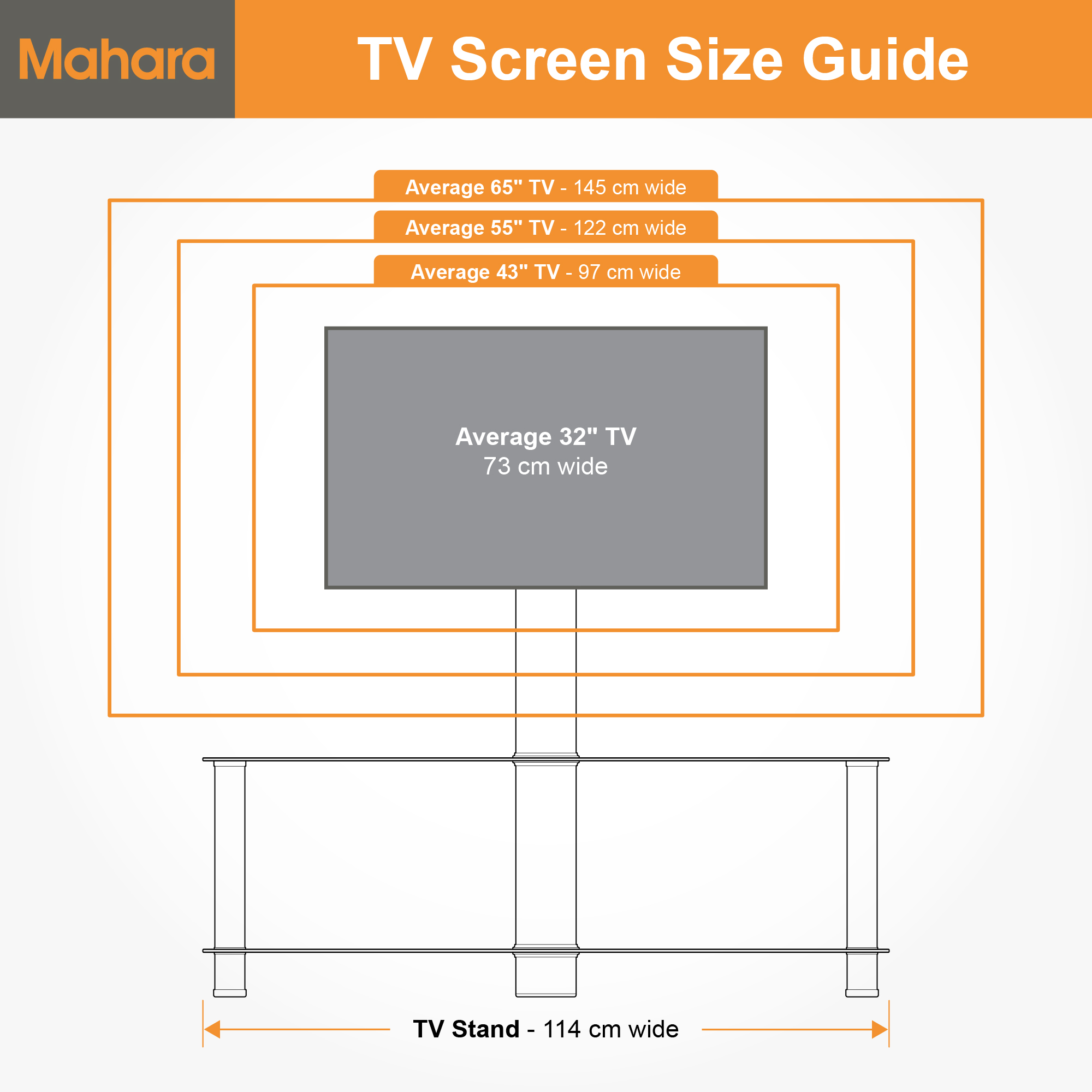 TV screen sizes are provided as a recommendation only. We recommend measuring the VESA wall mounting holes on the back of your TV prior to purchase to ensure compatibility with your TV. We include all the necessary fixings and fittings for assembly and installation.