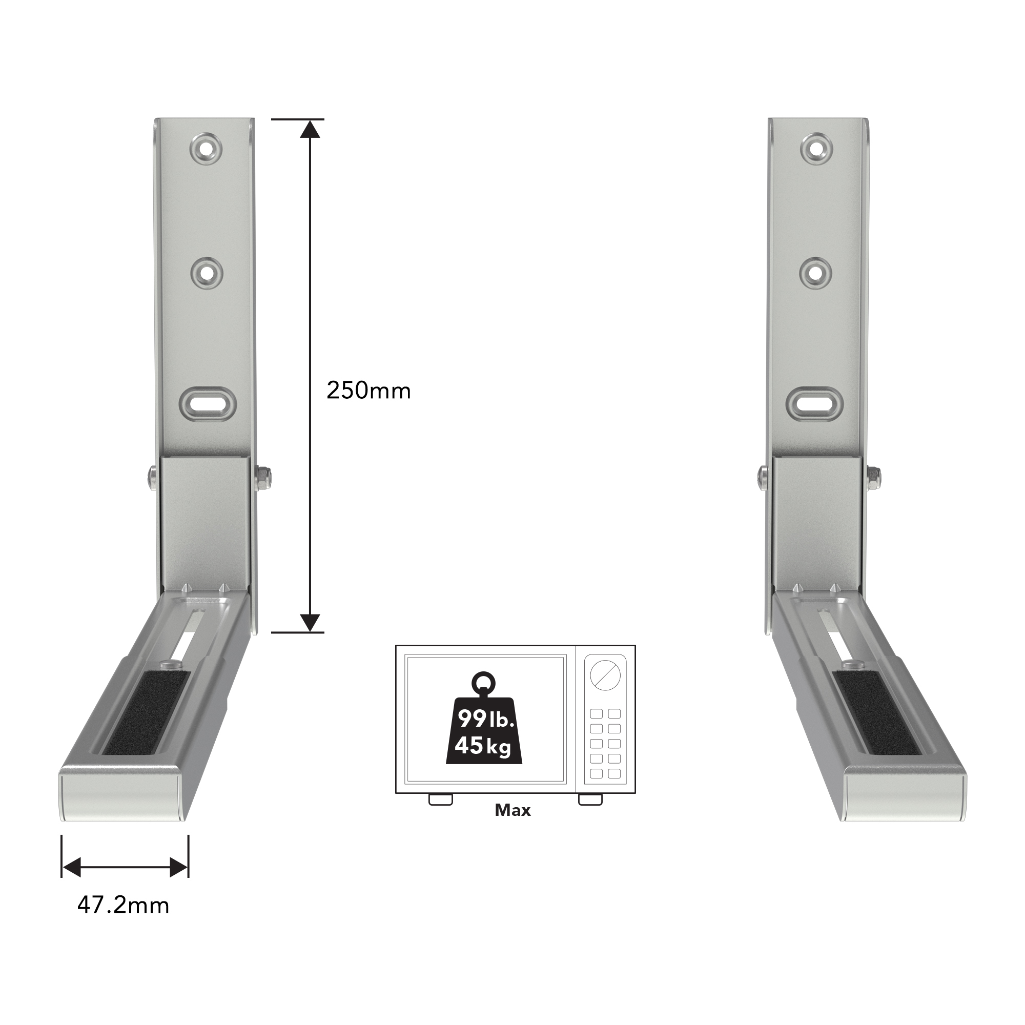 The brackets can safely hold microwaves up to 45kg, and are tested in-house to ensure they are safe and secure. We supply all necessary fittings and fixtures for assembly and installation of the brackets, plus full user friendly instructions for installation.